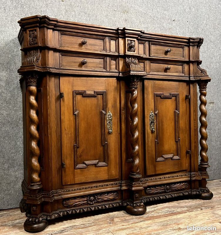 Pièce d'Antiquité pour ce buffet a hauteur d'appui Alsacien en bois massif teinté époque XVIIeme vers 1650 façade a ressaut ouvrant par 2 grands vantaux et 6 tiroirs le tout rythmé par trois colonnes torsadées surmontées de chapiteaux corinthiens on remarque une riche ornementation de cadres guillochés ainsi que des superbes sculptures en relief la partie haute donne l'impression d'un léger rétrécissement par deux dauphins stylisés l'ensemble repose sur trois pieds miches logés sous une corniche crantée a débordement Il faudra noter la rare qualité des sculptures qui agrémente l'architecture de ce meuble alsacien ancien d'exception h131 x 160 x 50